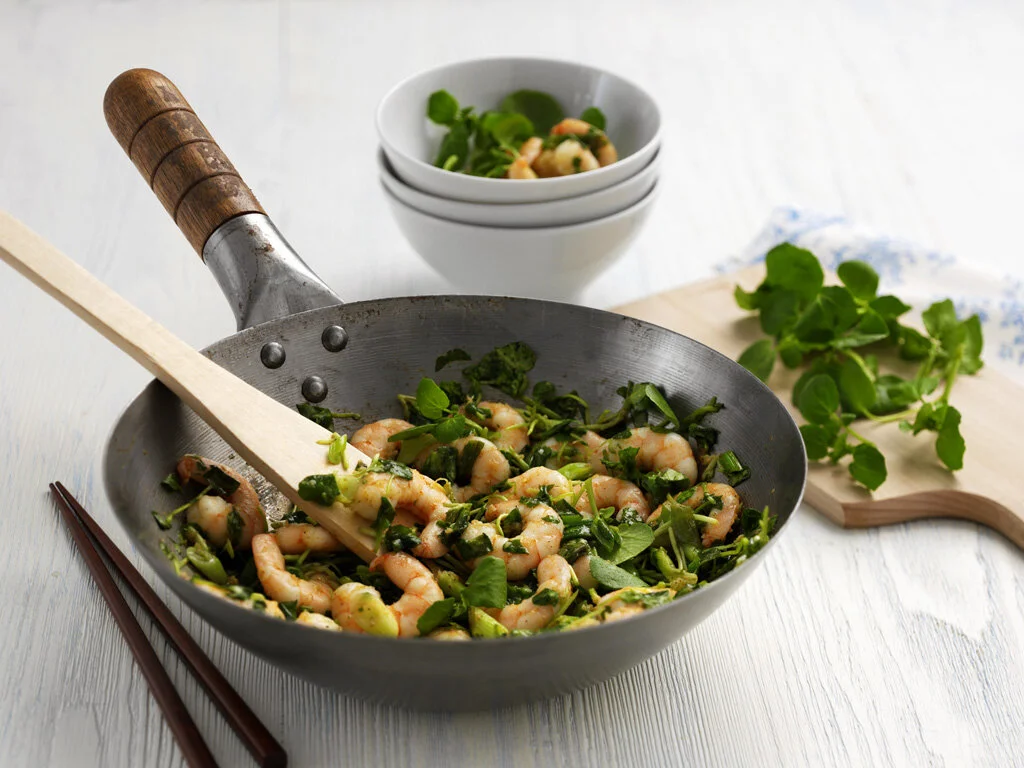 Spicy prawns with watercress