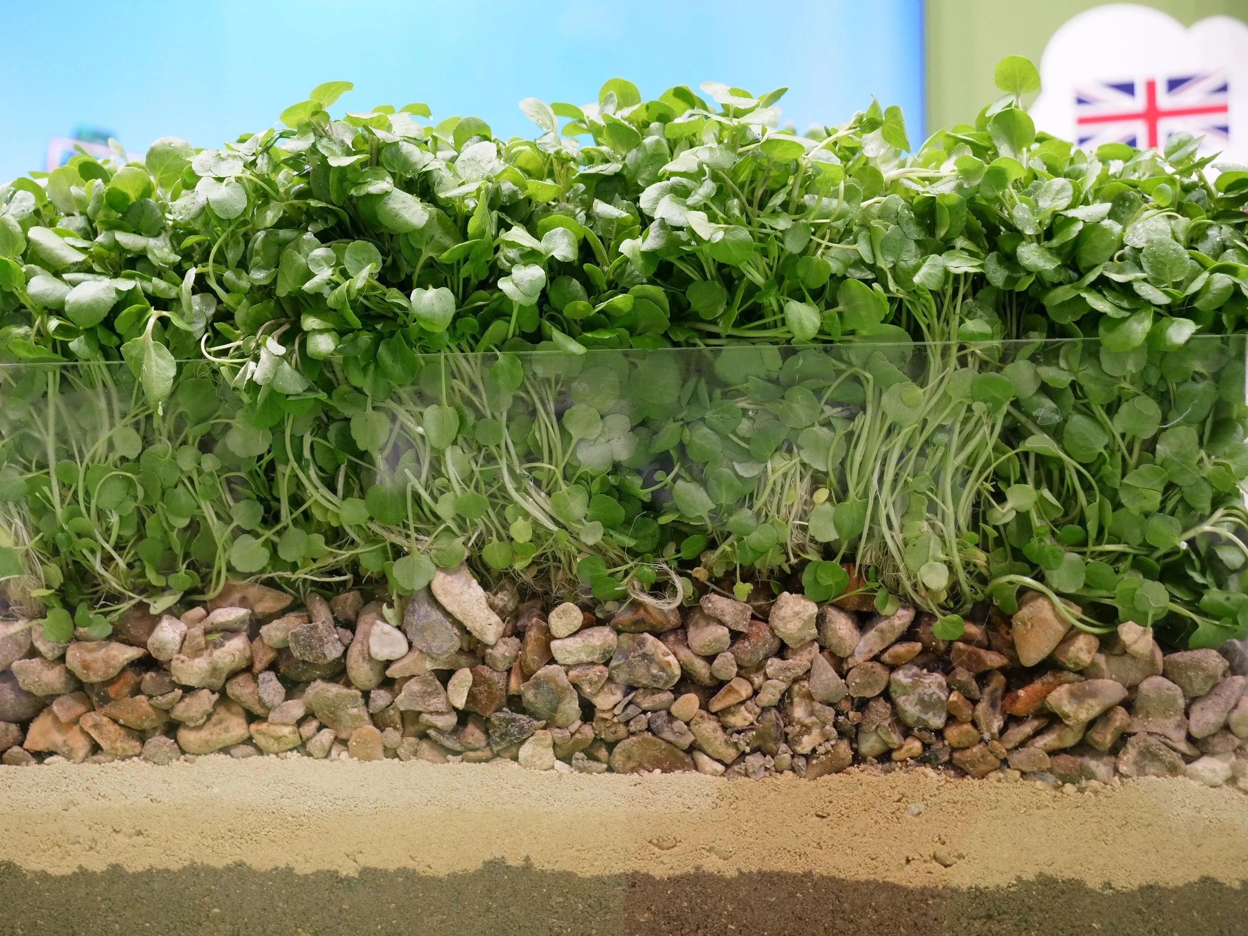 We now pre-germinate the seed in liquid BEFORE we add it to the beds. The little roots sink down into the gravel and give us a really good coverage – best of all, it’s peat-free & natural.